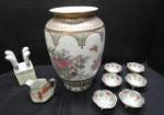 | Vintage Hull Art Pottery set consists of a basket vase and two matching candle holders in the Magnolia pattern, likely produced in the late 1940s. |