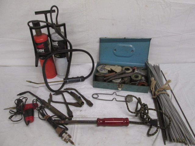 This large selection of soldering equipment/tools includes four partial rolls of solder, two partial cans of flux, a large bundle of aluminum welding rods, a Bernzomatic propane tank, a Bernzomatic Oxygen cylinder and more. These items are in used condition. Please preview.