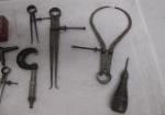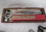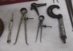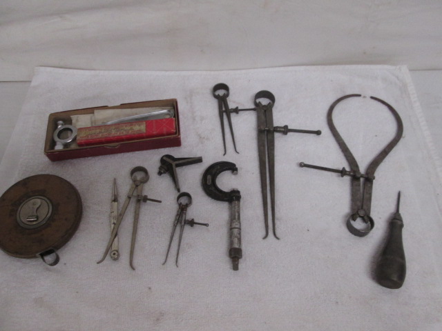 This collection of vintage machinist's tools includes a Starrett brand, vintage, measuring tape, a vintage, Starrett brand vintage center punch, a micrometer and more. These items are in vintage, good condition. Please preview.