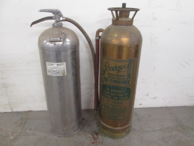 This interesting pair of vintage Badger fire extinguishers, one of which is a Badger Nautilus Water Filled Fire Extinguisher, are in vintage, good condition. Please preview.
