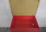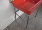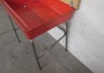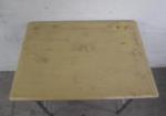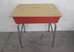 This vintage school desk with an open front and tan top measures 24"W X 18"D X 27"H. It is in vintage, used condition. Please preview.