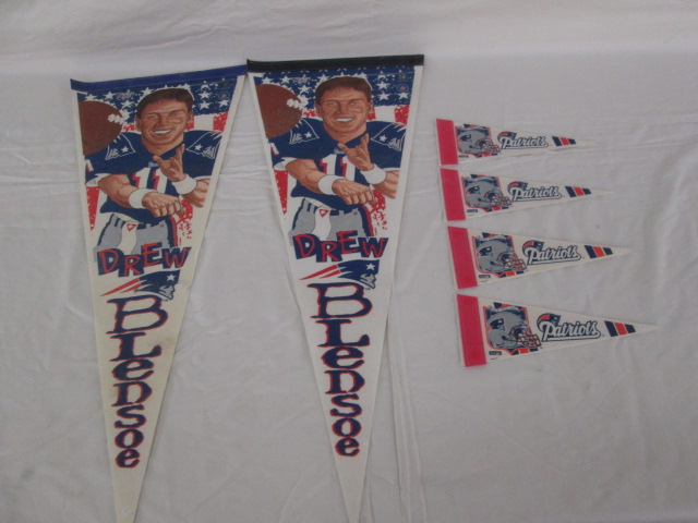 This assortment of six collectible Patriots pennants (two of which feature Drew Bledsoe), are in used, good condition. The two Drew Bledsoe pennants measure 30"L and the smaller items measure 10". Please preview.