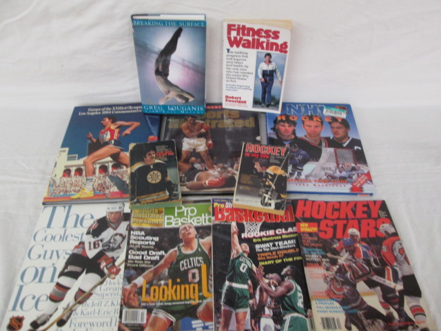 This collection of miscellaneous sports related reading materials includes two hockey paperback books (by Derek Sanderson and Phil Esposito), Fitness Walking, Breaking The Surface, sports magazines, and four hard cover books (including The Best of Sports Illustrated). These items are in used, good condition. Please preview.