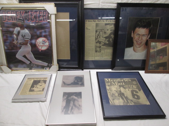 This nice collection of eight frames range in size from 9"X11" to 19-1/2"X 24". Images in the frames include sport related items featuring two photos of Dan Janson, an article regarding Janson in the 1988 Olympics, a photo of Derek Jeter and more. These items are in new and used, good condition. Please preview.