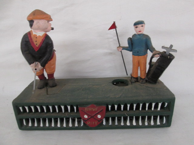 This vintage, collectible cast iron "Birdie Putt" golf mechanical bank is in vintage, good condition. Please preview.