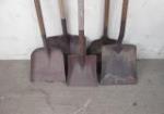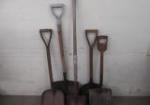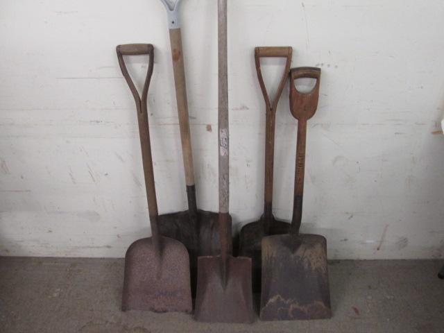 This assortment of five garden/coal shovels with wooden handles are a variety of sizes. Some handles have a āDā design for easier lifting. These items are in used, good condition. Please preview.