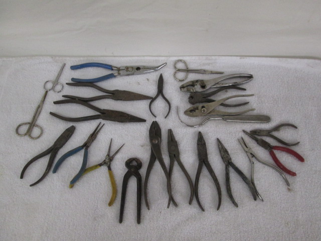 This collection of 20+ hand tools includes a variety of wrenches, a retractor, surgical scissors, and more. These items were possibly used for tying ties for fly fishing. These items are in used, good condition. Please preview.