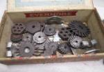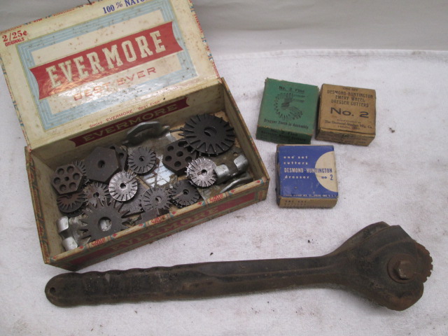 This collection of machinist equipment includes a vintage grinding wheel dresser (a tool used to clean and reshape the surface of a grinding wheel, two sets of Desmond-Huntington Emery Wheel Dresser Cutters, one set of Gardner abrasive wheel dresser cutters and more. These items are in vintage, good condition. Please preview.