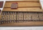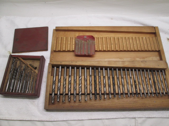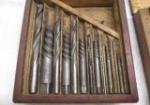 Set of vintage Russell Jennings auger drill bits in a wooden case. The lot also includes a set of eleven vintage drill bits in a sliding top box. These sets are in vintage condition. Please preview.