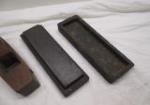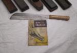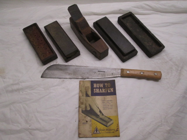 This lot includes an interesting Diamond brand Jungle machete, a vintage wood plane, and two Behr and Manning sharpening stones. These items are in used, good condition. Please preview.