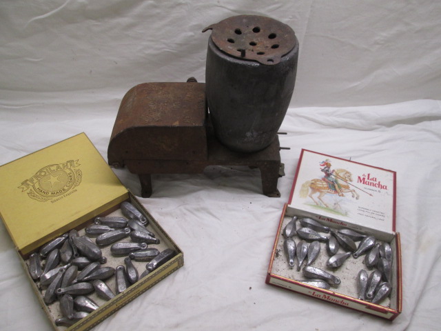 This miscellaneous lot includes over forty fishing weights, a vintage Johnson Gas Bench Furnace No. 101 soldering furnace and a vintage small bio-mass burner. The weights are in good condition. The Bench Furnace and bio-mass burner are in used, vintage condition with rust and wear due to age. Please preview.