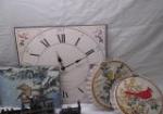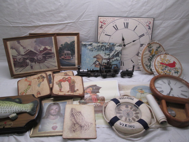This collection of battery operated clocks and home, wall decor includes a "Big Mouth Billy Bass", a school style clock, a nautical style clock, vintage wall art (four Norman Rockwell prints, a cute bird feeder print) and more. These items are in used condition. Please preview.