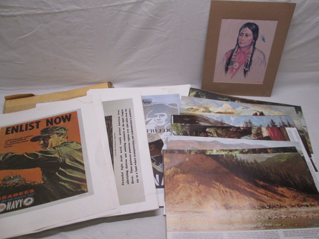 This interesting assortment of vintage prints and posters includes a set of twenty two 17" X 11" "Documentary Photo Aids Prints of Plains Indians" , an 11" X 14 matted B. McIvor print of a native American and 16 vintage U.S. Navy recruitment posters. These items are in vintage, good condition. Please preview.