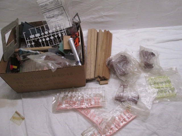 This nice assortment of model train accessories includes pieces for an operating coal tipple, miniature (people) figures, miniature street signs, landscape materials and more. These accessories are in new and used, good condition. Please preview.