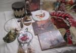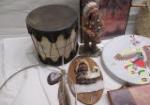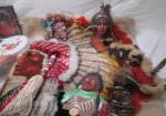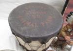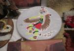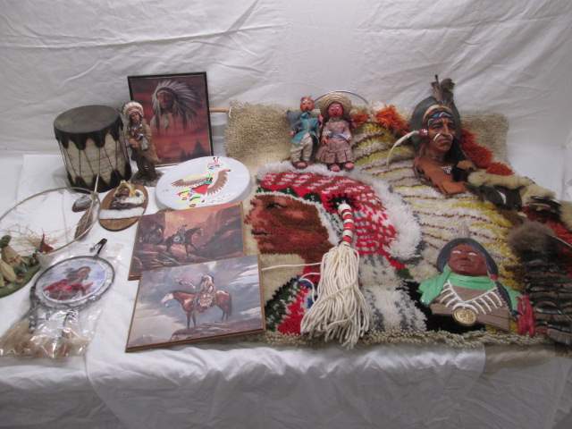 This lovely collection of Native American inspired wall hangings and collectibles includes a 31" X 31" hooked rug style wall hanging, a new 7" dream catcher, three 10" X 8" Native American prints, a vintage birch drum from Benson's Wild Animal Farm and more. These items are in used condition unless otherwise noted. Please preview.