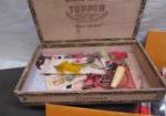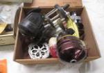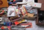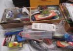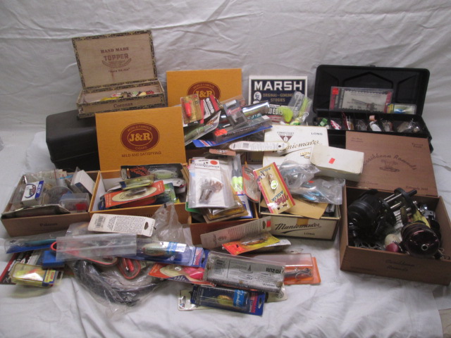 This large box of fishing tackle includes a variety of lures (for salt water and fresh water), spinners, rubber bait, weights, jigs, reels, hooks and more. These items are in new and used, good condition. Please preview.