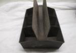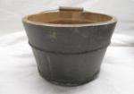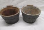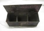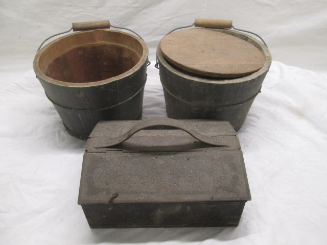 This pair of vintage 7" wooden baskets (one has a lid) with metal handles and a vintage metal cantilever tool box are in vintage, used condition. Please preview.