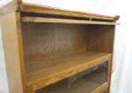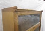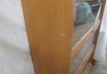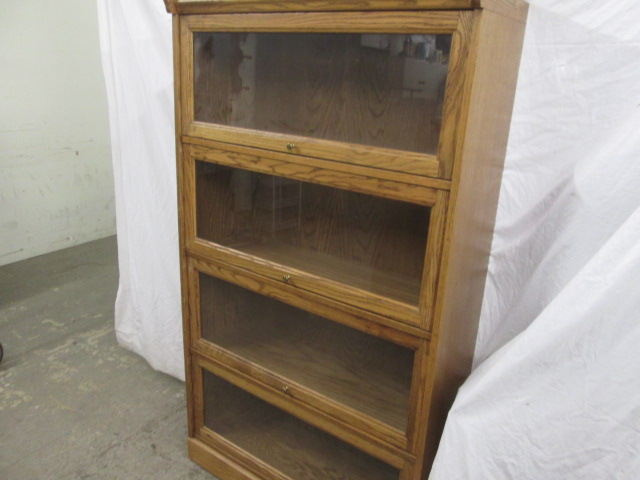 This gorgeous oak wood and composite four pane barrister style bookcase measures 36"W X 11-1/2"D X 63"H. The four doors lift and slide back into the unit. This item is in good condition. Please preview.