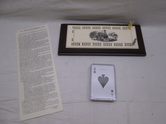 This lovely Barlow, train style, cribbage board set with game instructions is in very good condition. Please preview.