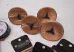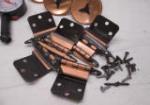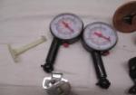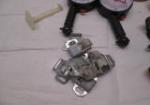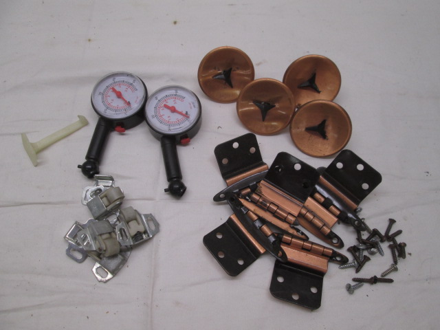 This miscellaneous lot of various items includes a pair of plastic tire gauges, four mid century drawer pulls with matching hinges, and 6 roller cabinet latches. These items are in used, good condition. Please preview.