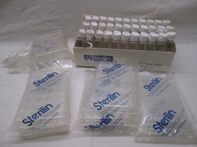 This collection of small plastic "Sterilin" medical containers marked "For Tissue Cultues" includes five types of containers. These items could be utilized to store a variety of small items. These containers are in new condition. Please preview.