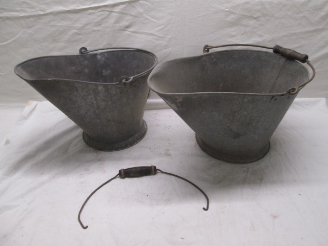 Pair of older galvanized ash buckets with extra handle. Both pails have handles, one has an additional wood wrap along with the extra handle included. Both in good condition. Please preview.