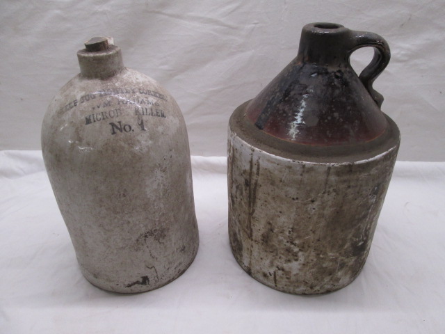 Jug marked "Keep Jug Tightly Corked, WM Radams Microbe Killer, No. 9" and 2 Tone 2 Gallon Crock Jug. The Radams microbe killer Jug does have cracks, still has cork. No cork on the 2 gallon jug. The 2 tone jug has wear but no cracks. Please preview. Great pair.