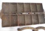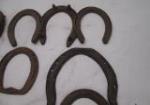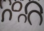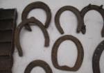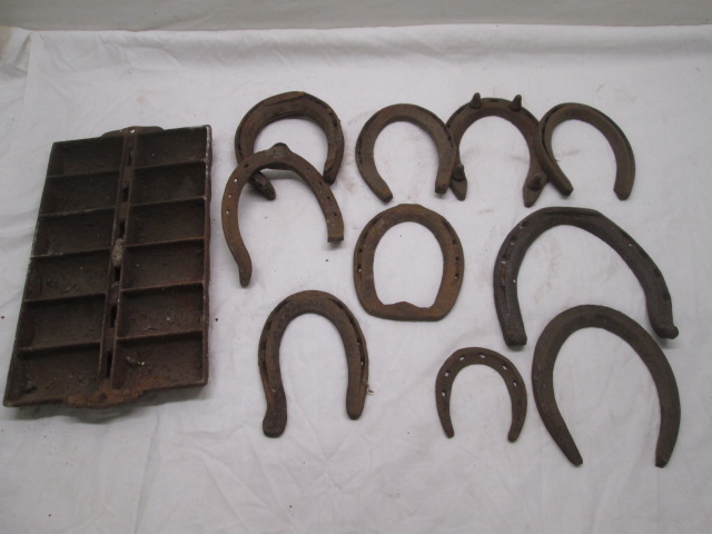 Cast iron mini loaf pan and assorted vintage horseshoes. Used but no rot holes. Need to be cleaned to be used or display. Please preview.