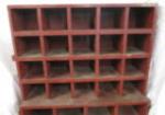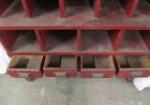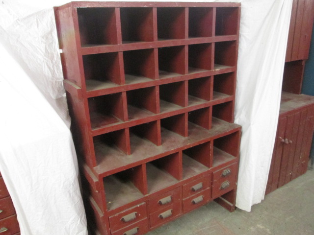 Fantastic antique pigeonhole/cubby sorting cabinet with antique hardware. Measures approximately 62 in tall by 43 and 1/2 in wide by 15 and 1/4 in deep. Solid and super heavy. Great old piece painted in a barn red color. Please preview.