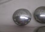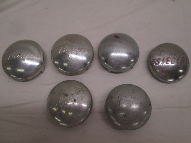 Six vintage doll carriage wheel caps. Thayer, Siebert and unbranded.
