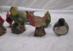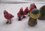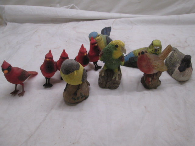 Tray lot of colorful birds including some battery-powered cardinals that sing, a Stone Critters parrot and more. Please preview.