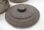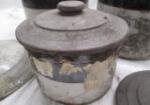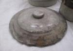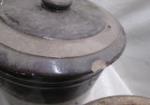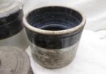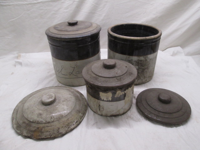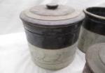 3 old crocks with 2 Lids. The smaller crock has lots of surface chipping and the lids don't fit perfect. Please preview