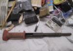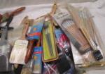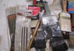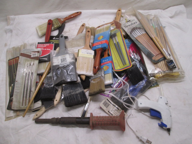 Box lot of paint brushes. some new, some used. Also includes a glue gun and a Remington power actuated tool model 476. Please preview.