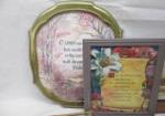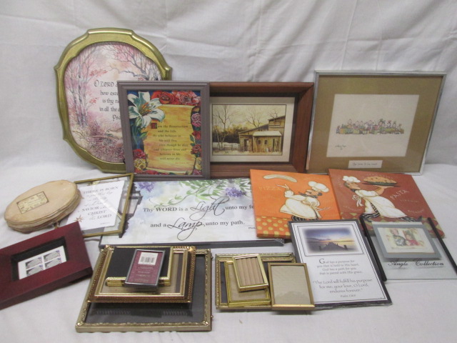 This nice selection of nineteen wall art pieces and photo frames (9) includes five religious quotes, a pair of "Italian Cooking" images, a country print featuring a country barn and more. These items range in size from 2-1/2" X 3-1/2" to 14" X 12". These items are in used, good condition. Please preview.