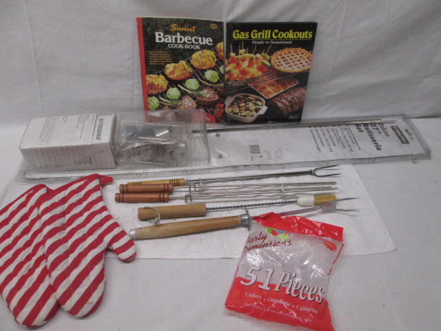 Not too late for a Barbecue! This nice set of barbecue utensils/tools includes a (new) "BBQ Pro" deluxe 37" Rotisserie Set, five grilling tools, grilling mitts and two barbecue cook books. These items are in new and used, good condition. Please preview.
