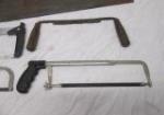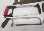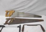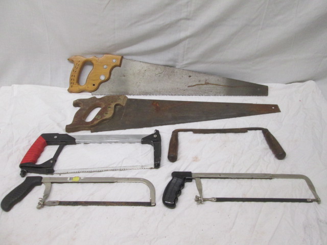 This selection of six saws includes two hand saws, two hack saws, a Craftsman hack saw, and a two handle woodworking drawknife. These items are in used, good condition. Please preview.