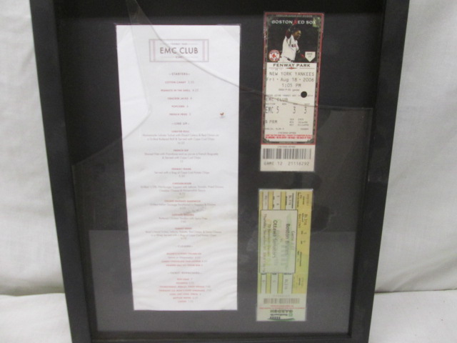 2006 Fenway Park Ticket against the Yankees and a Boston Garden Ticket from 2005 with EMC Club Menu. Unfortunately, the glass is broken in the frame but the items are intact. Please preview.