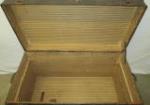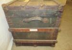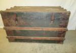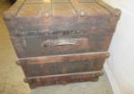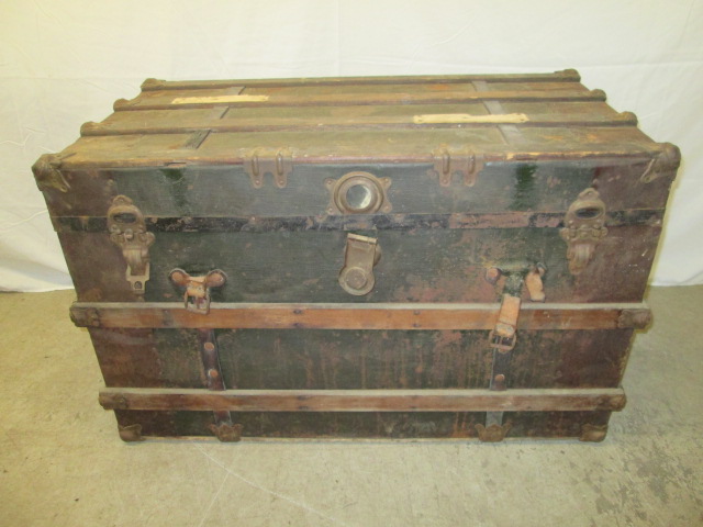 This antique steamer trunk with leather straps measures 36"W X 19"D and 23"H. It is in antique condition. Please preview.