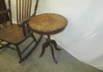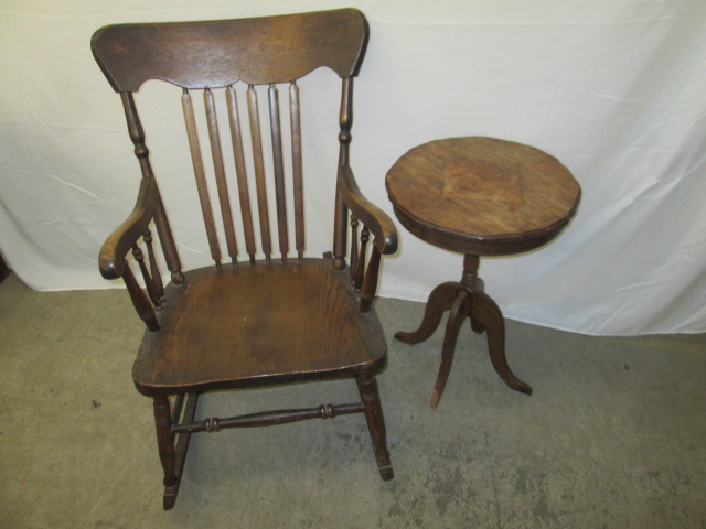 This cozy W.F. Whitney Chair Co. country rocker and vintage pie crust style side table are in used condition. The table measures 16"W X 16"D X 24"H. Both pieces have been repaired, the table has damage to one of the feet. Please preview.