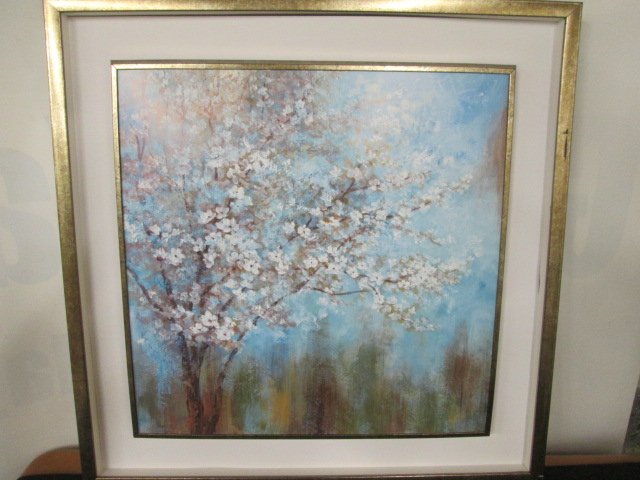 This charming 31-1/2" X 31-1/2 gold toned framed print titled "Cherry Blossoms" by the artist Nan is in good condition. Please preview.