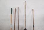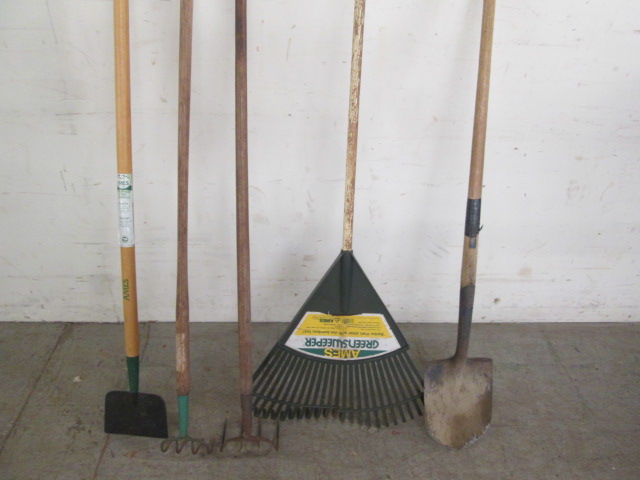 This collection of five garden/yard tools includes an Ames brand leaf rake, an Ames ice scraper, a garden shovel and two cultivating rakes. These items are in used, good condition. Please preview.