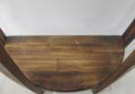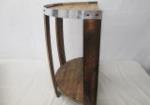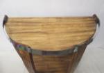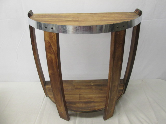 This charming rustic side table with a unique half barrel design features lovely wood and a metal barrel ring. This item measures 22"W X 11"D X 24"H. It is in good condition. Please preview.
