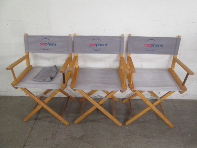 This trio of matching Netphone marketing director's chairs are in used condition. They are sturdy, however, the canvas seats and back are faded. Please preview.
