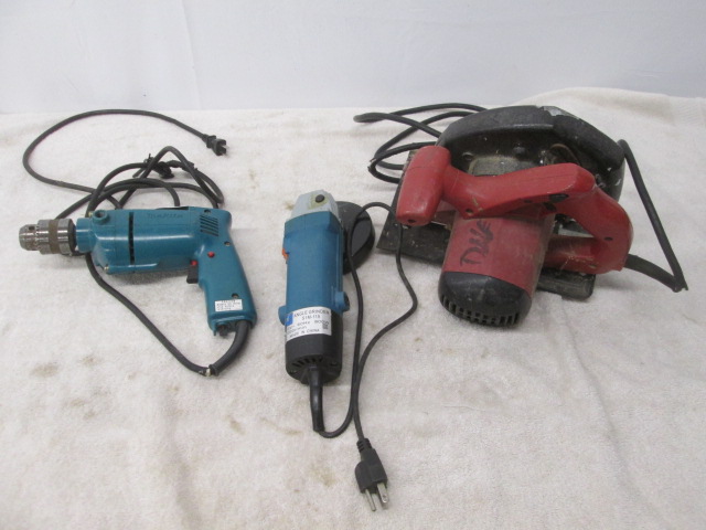 This trio of electric hand tools includes a HY Angle grinder, a Makita drill, and a Skilsaw 13 amp circular saw. These items are in used condition. The Skilsaw and Makita products will require repair as the cords are damaged. Please preview.