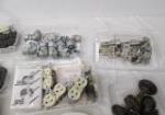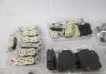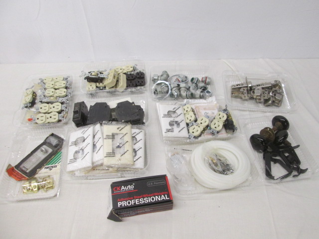 This electrical /hardware supply lot includes sixteen 15 amp duplex electrical replacements for heavy duty outlets, over fifteen switch plate covers, a pair of vintage door knobs, five cabinet door hidden hinges, nine 90* liquid-tight conduit connectors and more. These items are in new and used, good condition. Please preview.