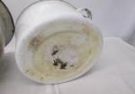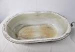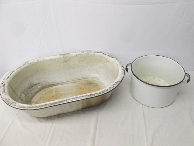 This two piece set of vintage enamelware includes an enamel baby bath tub (27"L X 18"W X 7"H) and a small handled pot. These items are in vintage condition and show wear due to age. Please preview.