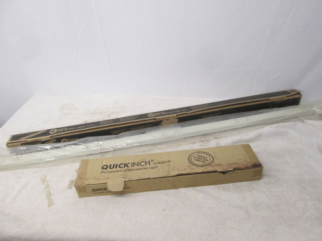 Let there be light with this trio of lighting items including a "Quick Inch by Alkco" fluorescent under the cabinet light, an Acuity brand 4' (2 lamp) LED strip light and a Hubbell brand 5' portable Plugtrak. The two lights are in opened boxes but appear to be in new condition, the Plugtrak is in a sealed bag and is new. Please preview.