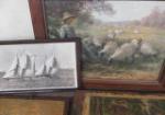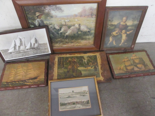 This collection (seven pieces) of vintage wall decor features a pair of 15" X 10" decoupage prints of Maritime vessels by John O'hara Cosgrave, a 20" X 12" decoupage print titled Brook Trout Fishing, a 25" X 20" print of "Child Tending Sheep" in a wooden frame, a 17-1/2" X 11-1/2" photo of two sailing vessels and more. These items are in vintage condition. Please preview.