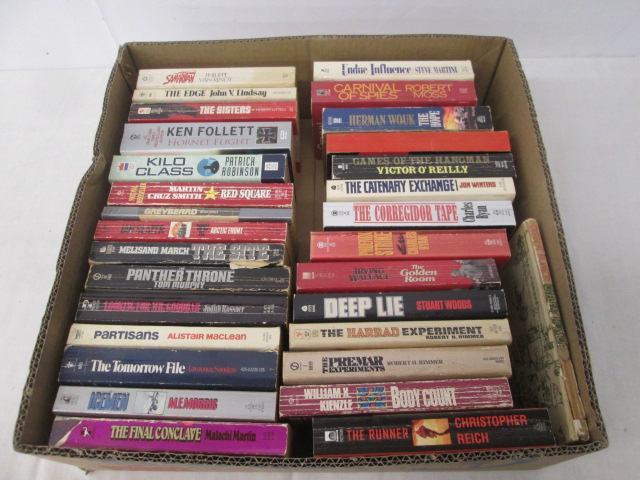 This large assortment of 30 paperback books from a variety of titles and authors, includes "The Tomorrow File", "Deep Lie", Hornet Flight", "The Edge", "Fletch" and many more. These books are used condition. Please preview.
