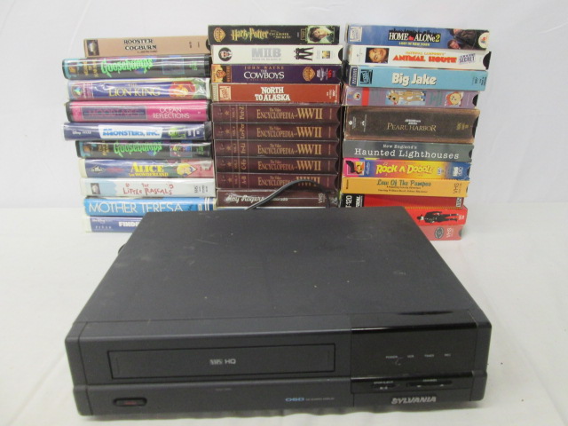 Nice Sylvania VCR player (model # VC4310AT01) with a large collection of 30+ VHS tapes from a variety of genres. THe VHS collection includes "Home Alone", Animal House", "Goosebumps", "Alice In Wonderland" and more. These items are in used, good condition. Please preview.